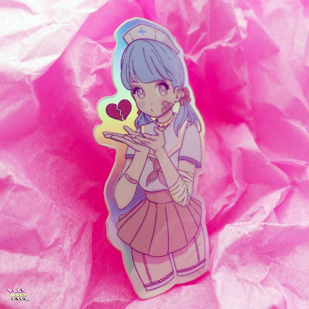 This anime nurse waterproof vinyl sticker is all you need to make your ouchies go away. See her eyes and outfit glitter with our premium holographic shine. Use to decorate your phone, laptop, water bottle or notebook to add some life and cuteness!