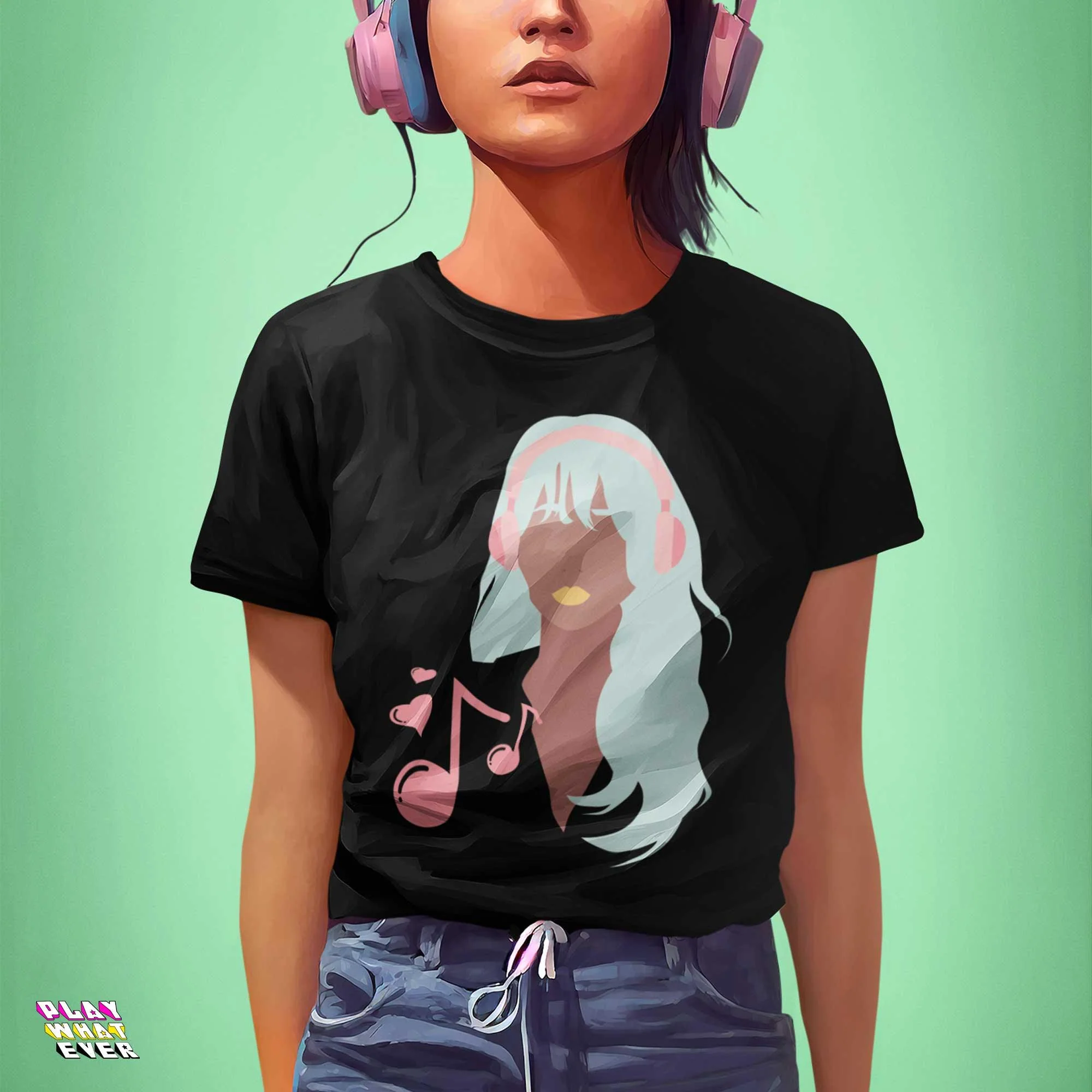 Music is love, and love is music. Beautiful girl with pink headphones listening to her favorite tunes in modern vector art style. Great to relax in with your music, or to wear out for a casual day with your friends, jamming together or going to karaoke.